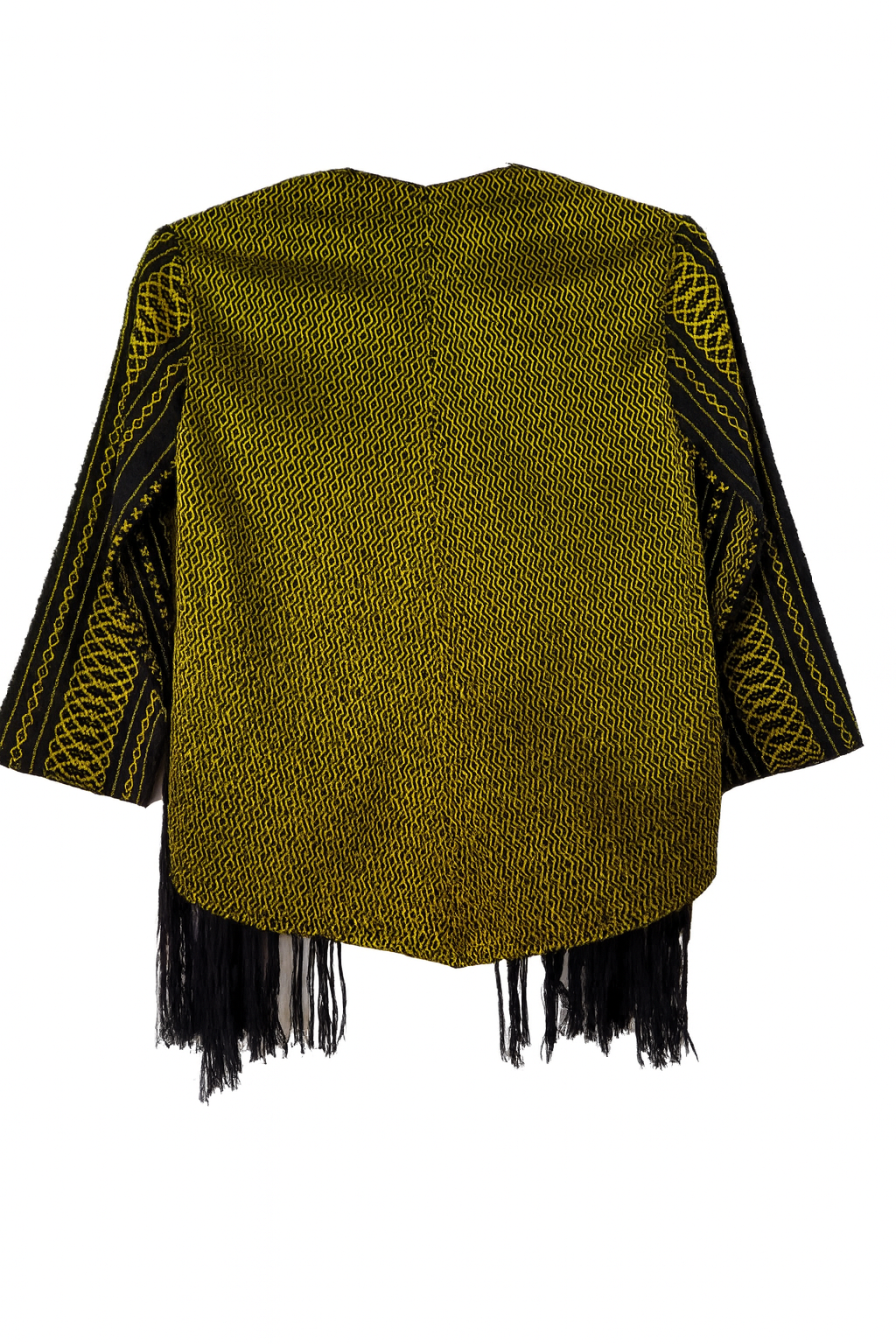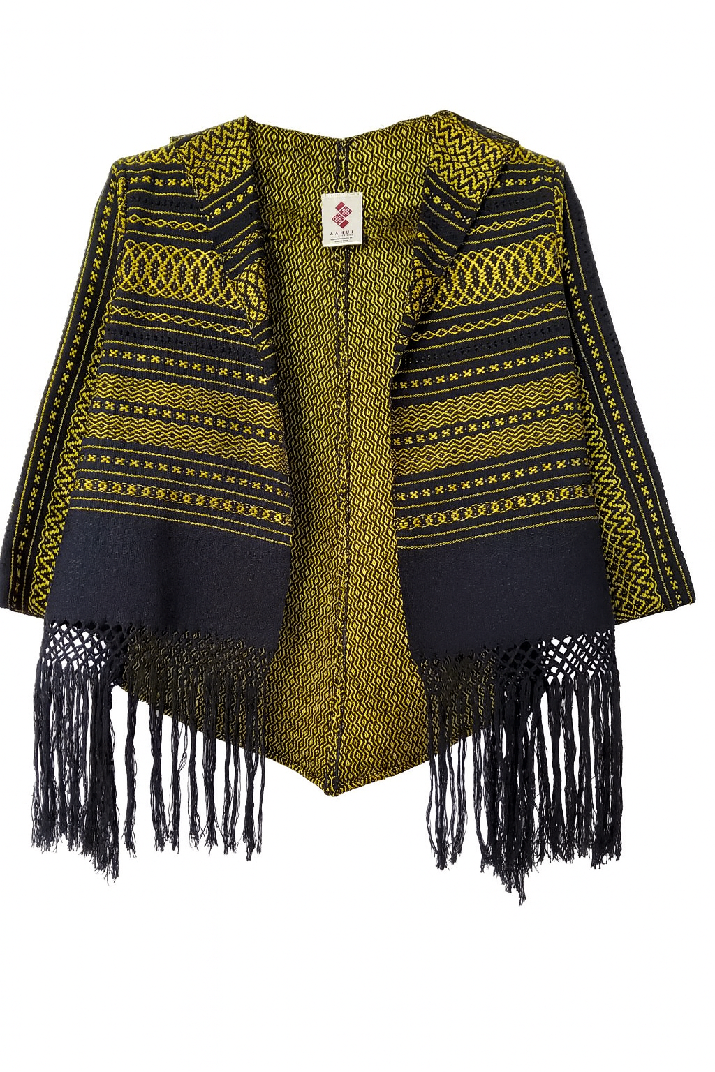 Saco hecho con rebozo de Oaxaca talla extra chica, con mangas, solapa y puntas de rebozo en el delantero
